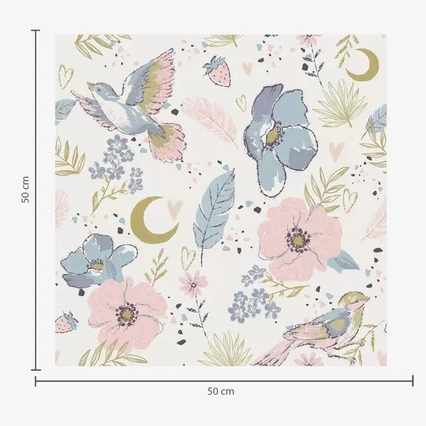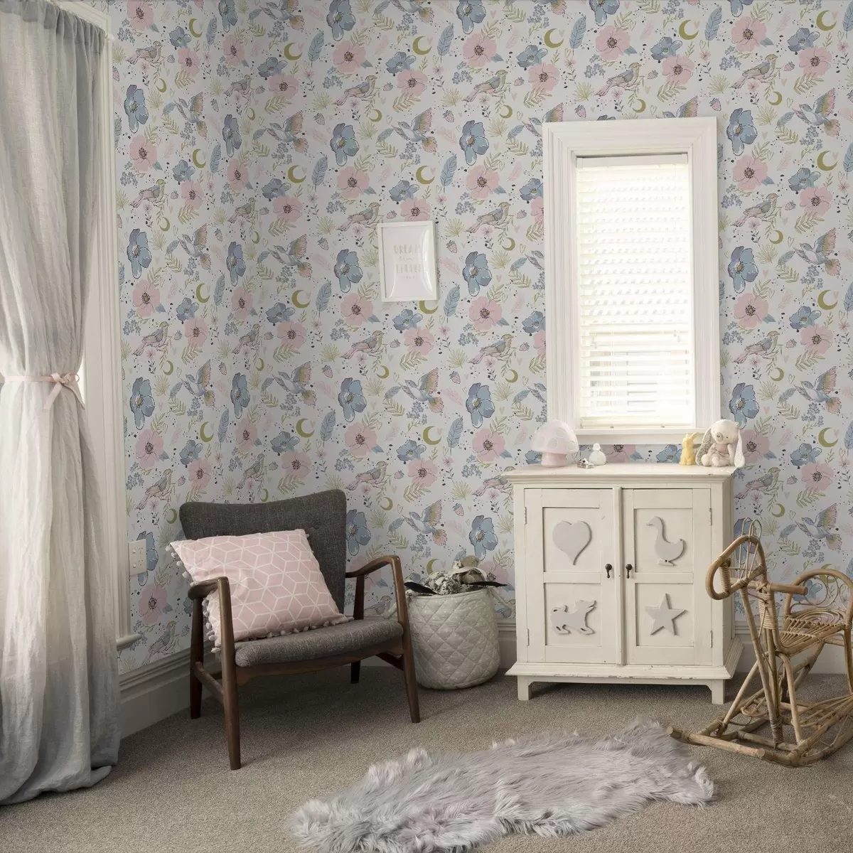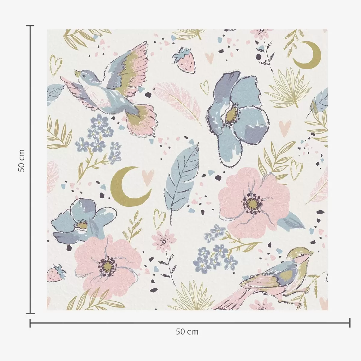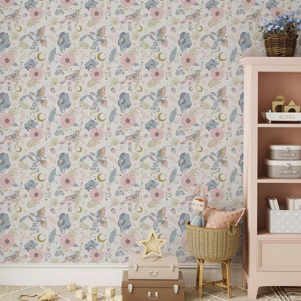 Tapeta Pastelne ptice i cvijeće s polumjesecima na bijeloj pozadini br. a00721