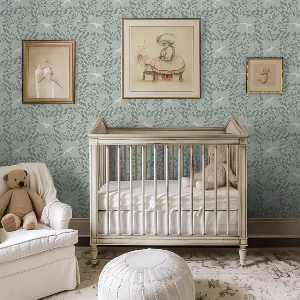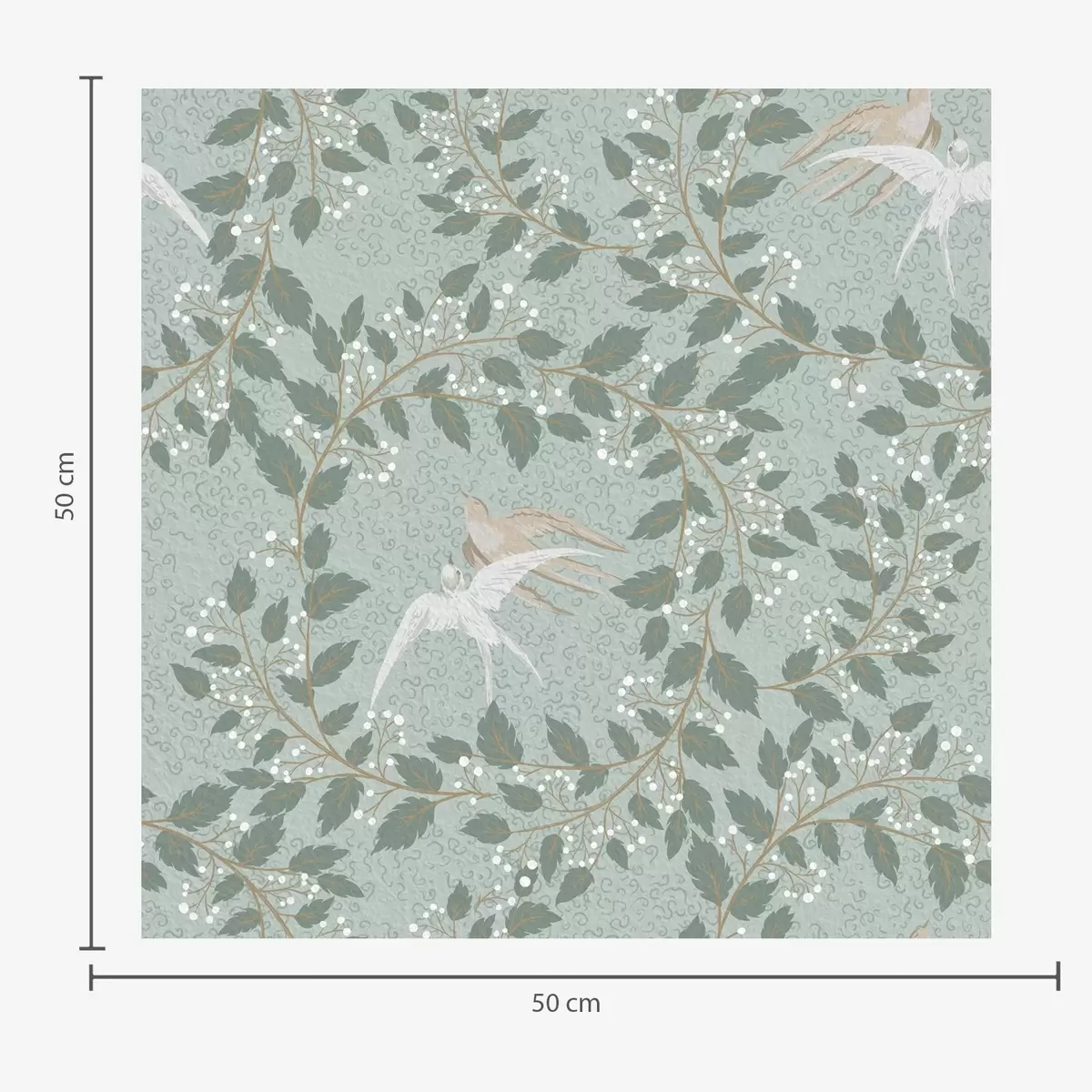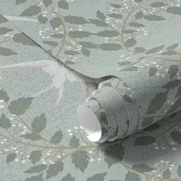 Tapeta Grane s bijelim bobicama i pticama na zelenoj pozadini br. a00731