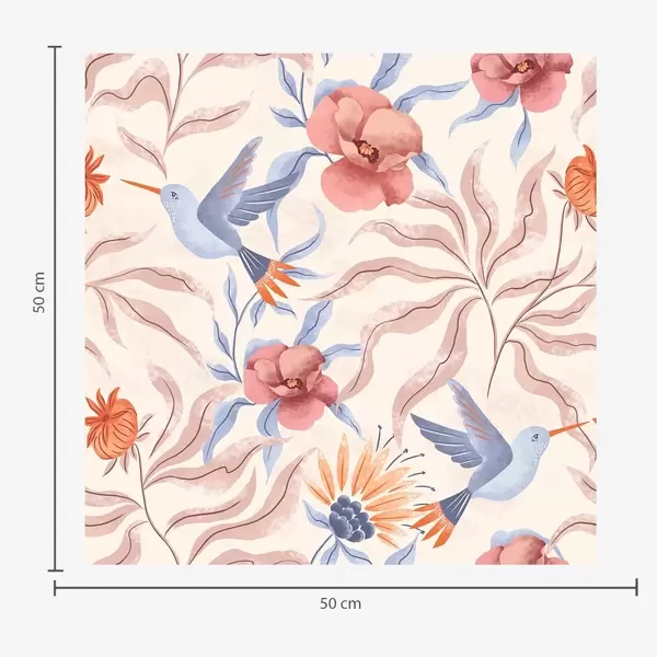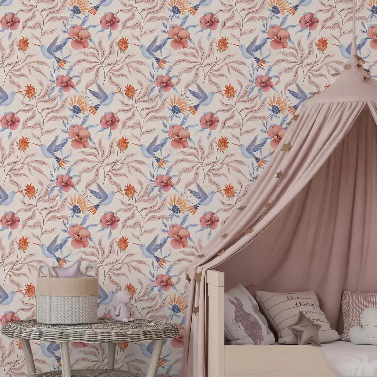 Tapeta Kolibrići među velikim cvijećem u ružičastim i plavim tonovima br. a00733