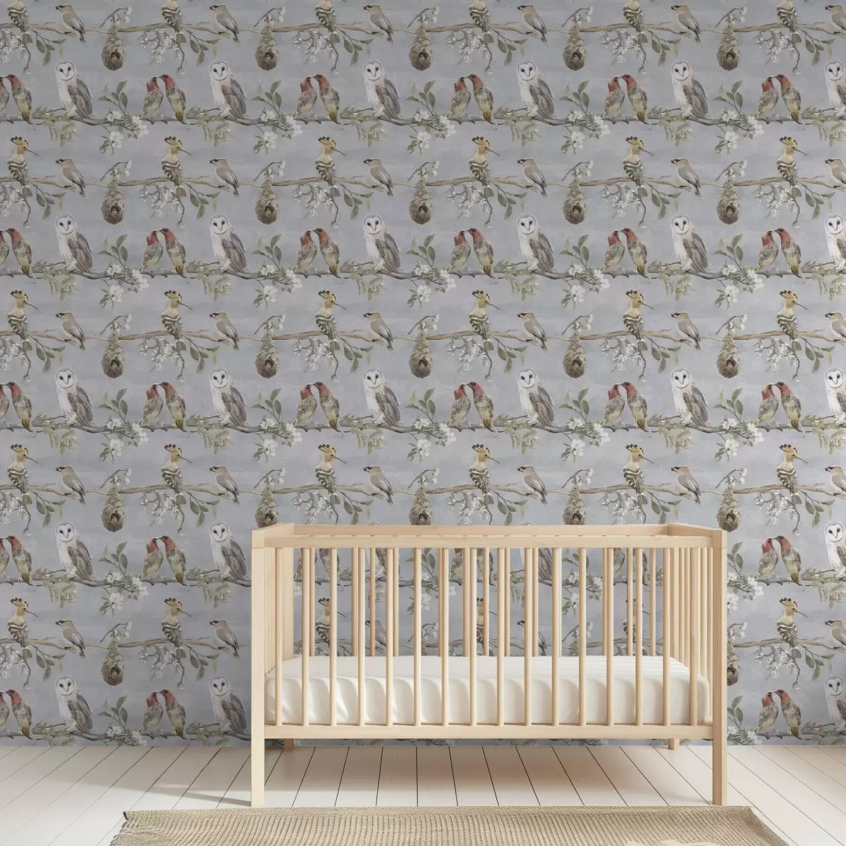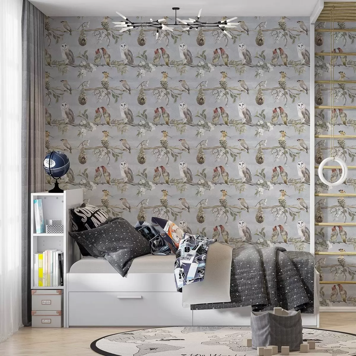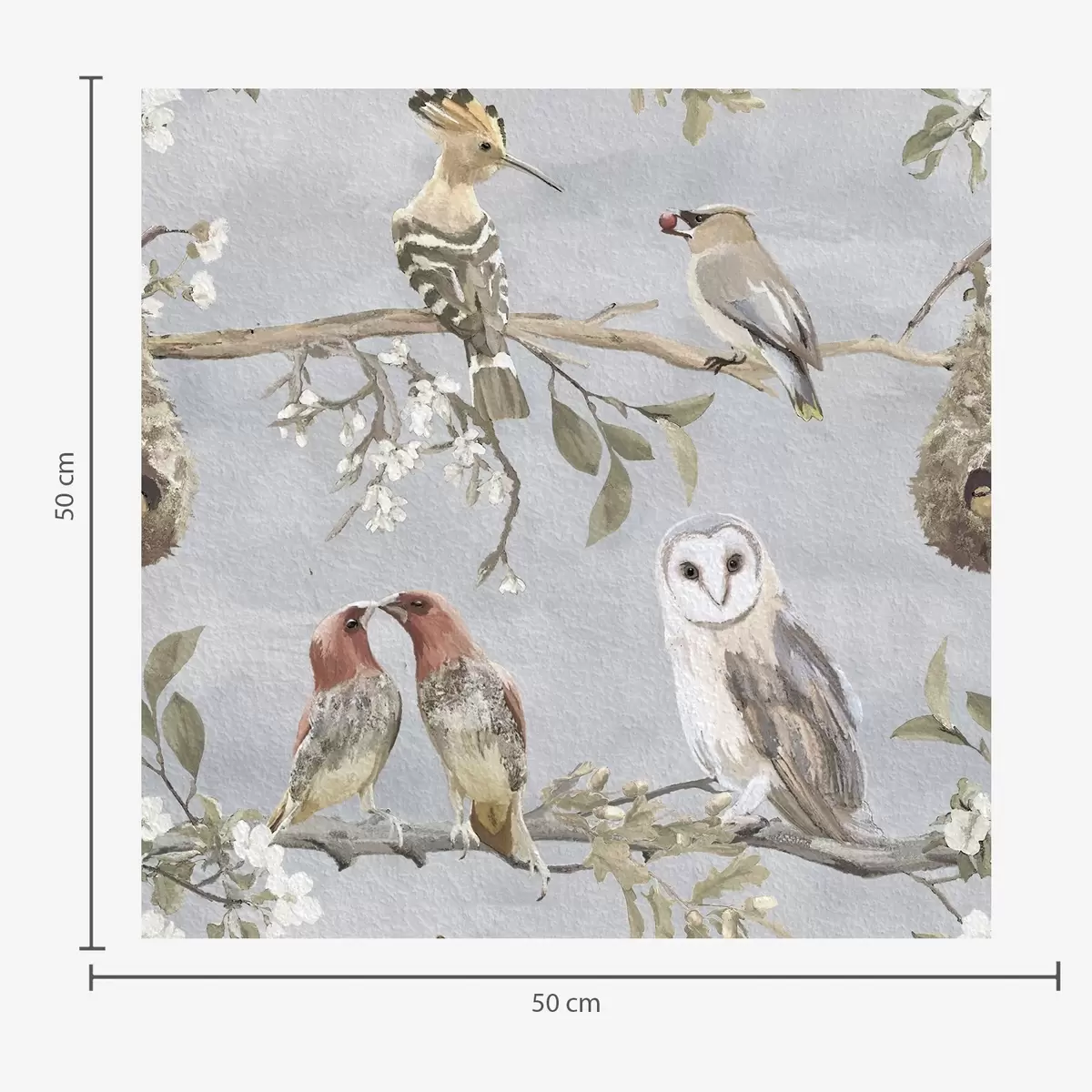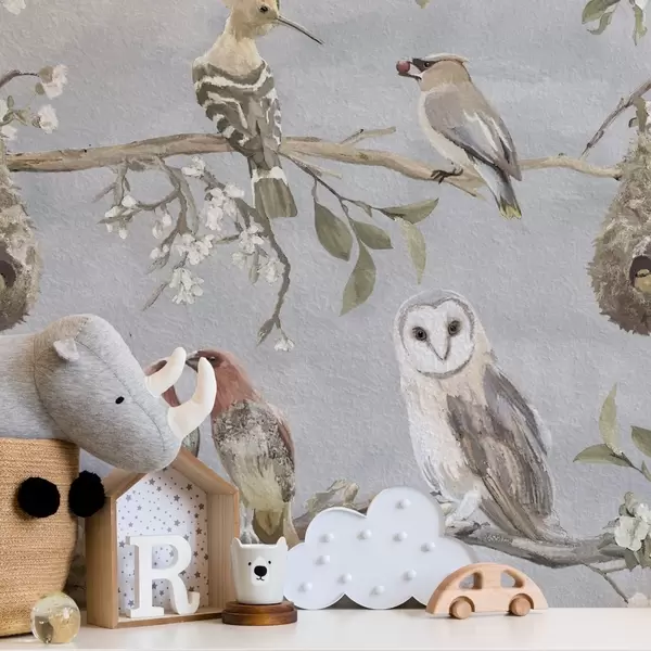 Tapeta Ptice na granama s cvijećem na sivoj pozadini br. a00738