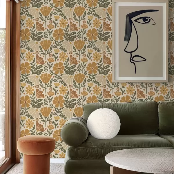 Tapeta Stilizirano cvijeće u toplim tonovima sa srcima br. a00752