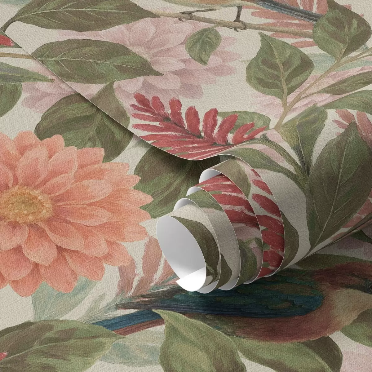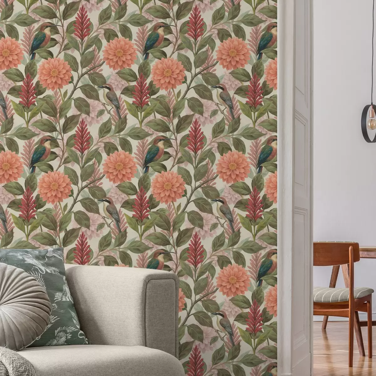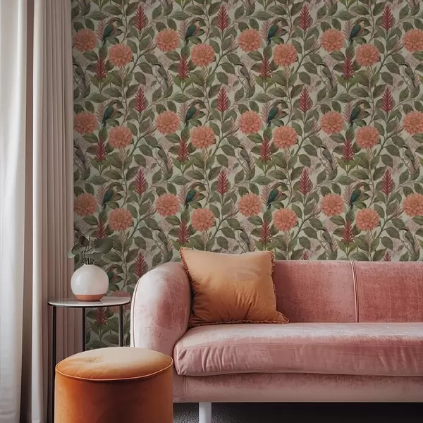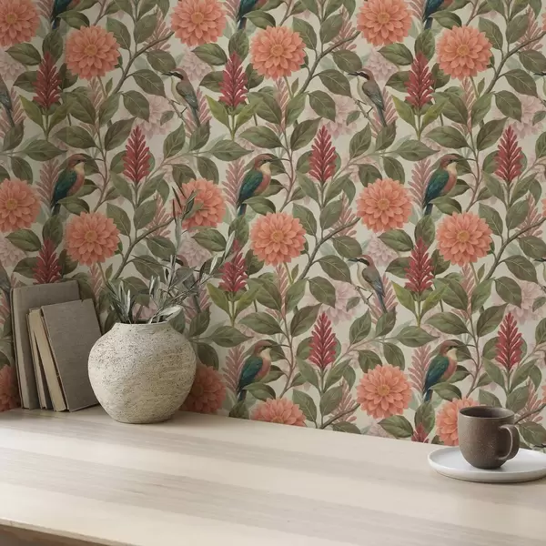 Tapeta Ptice među cvijećem i lišćem u toplim tonovima br. a00753