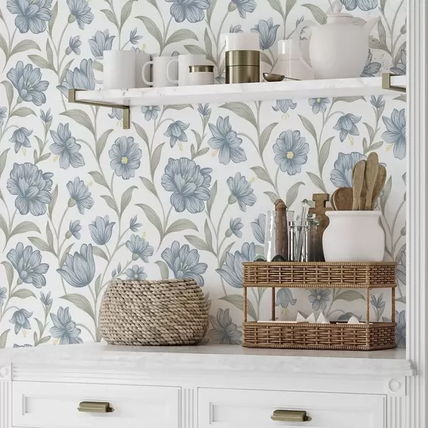 Tapeta Prašnjavo plavo cvijeće s listovima masline na bijelom br. a00780