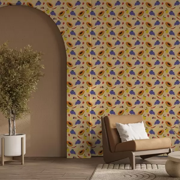 Tapeta Papaja, citrusi i bobičasto voće na bogatoj toploj pozadini br. a00803v1