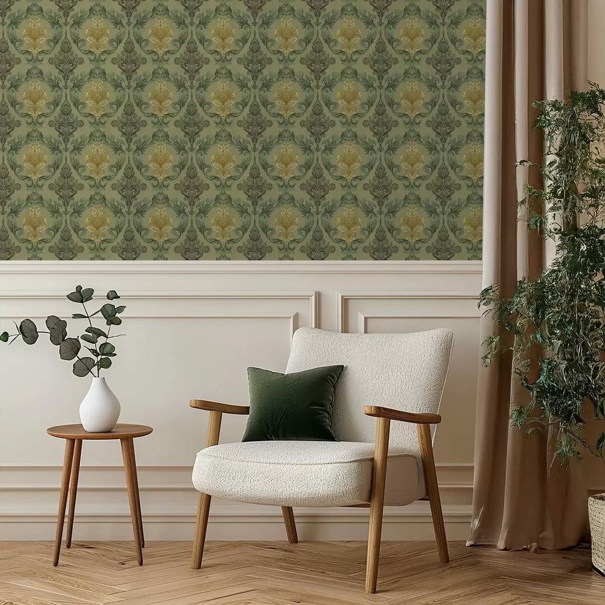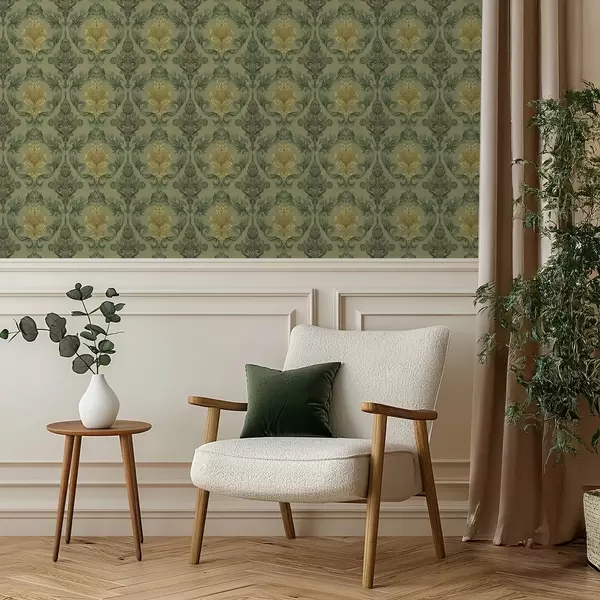 Tapeta Damask s biljnim svitcima, maslinasto-oker paleta br. a00828