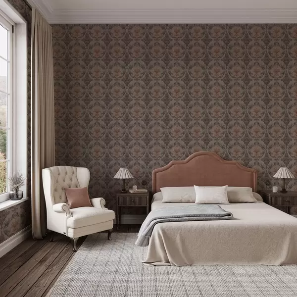 Tapeta Damask u smeđe-terakot paleti, toplo siva pozadina br. a00828v2