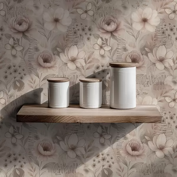 Tapeta Sepija bež cvjetni uzorci s leptirima i linearnim akcentima br. a00870