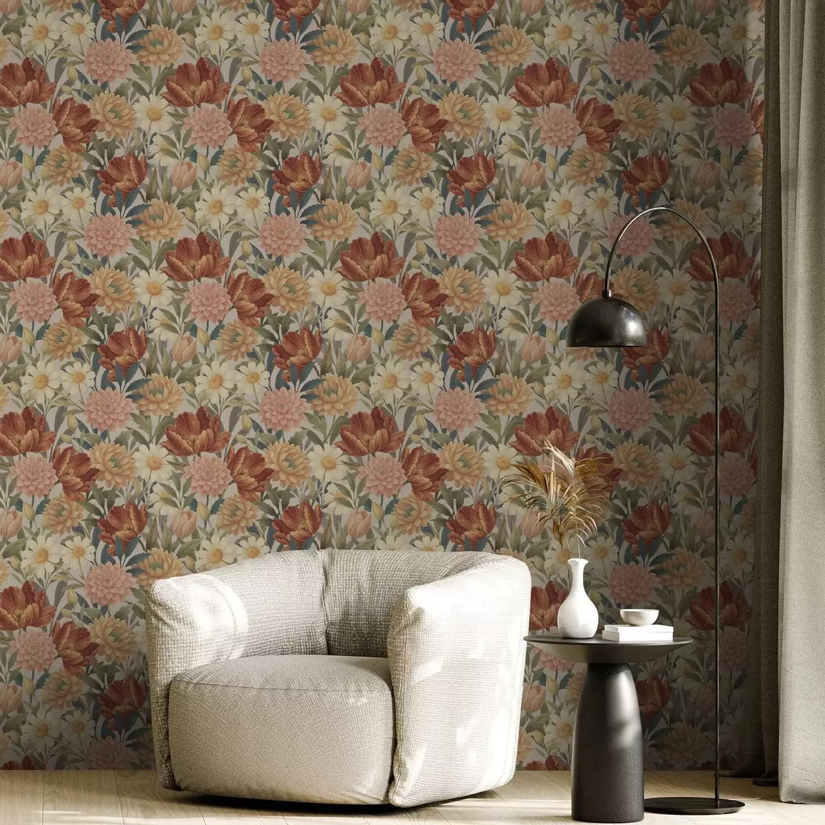 Tapeta Cvjetovi starinskog vrta u toploj terakota i breskvastoj boji br. a00874