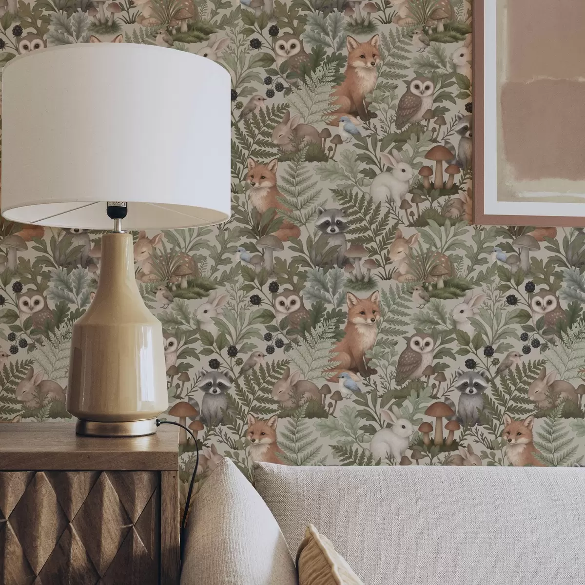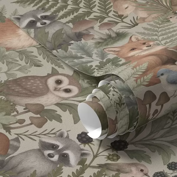 Tapeta Šumske životinje, paprati i gljive na svijetlo bež boji br. a00880v1