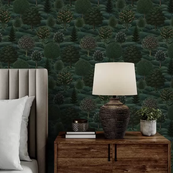 Tapeta Bogati zeleni valoviti krajolik s uzorkovanim drvećem br. a00892