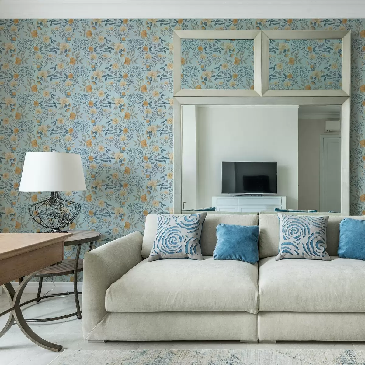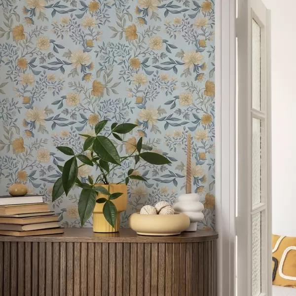 Tapeta Žuto i plavo cvijeće s lišćem na nebesko plavoj pozadini br. a00934
