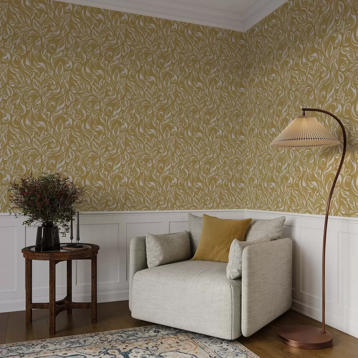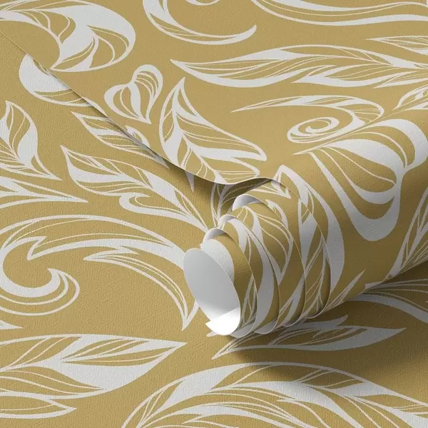 Tapeta Krem-bijeli lisnati ornament na toploj oker pozadini br. a00940v1