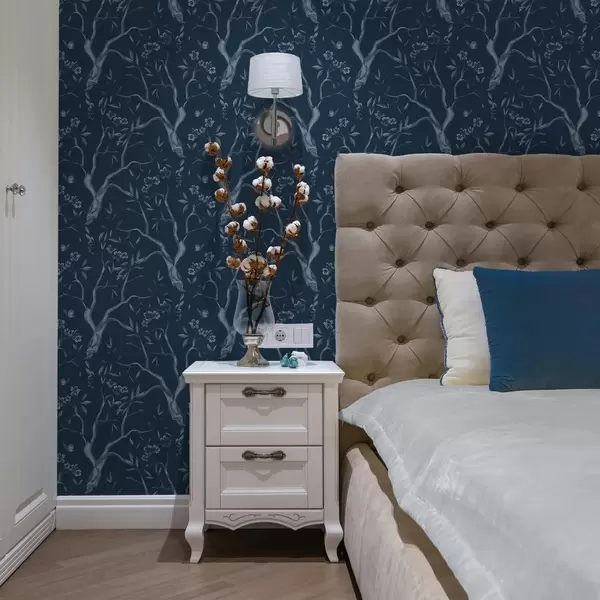 Tapeta Plave cvjetajuće grane s leptirima na tamnoj pozadini br. a00951v1
