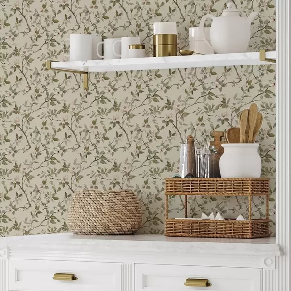 Tapeta Svijetle grane s malim krem cvjetovima i zelenim lišćem br. a01028
