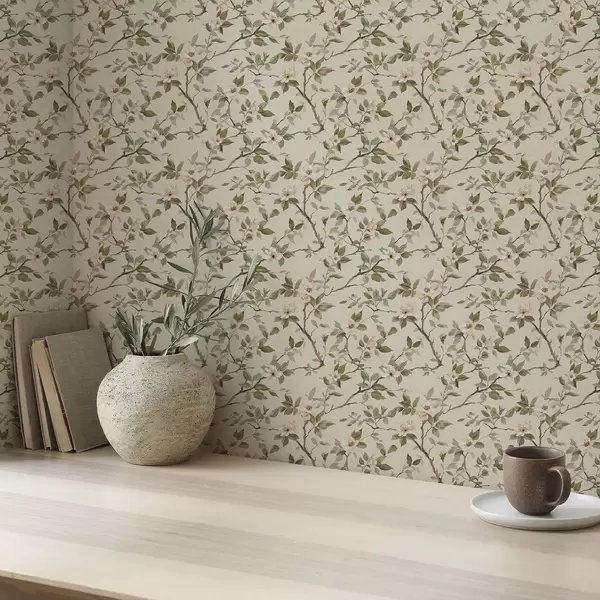 Tapeta Svijetle grane s malim krem cvjetovima i zelenim lišćem br. a01028