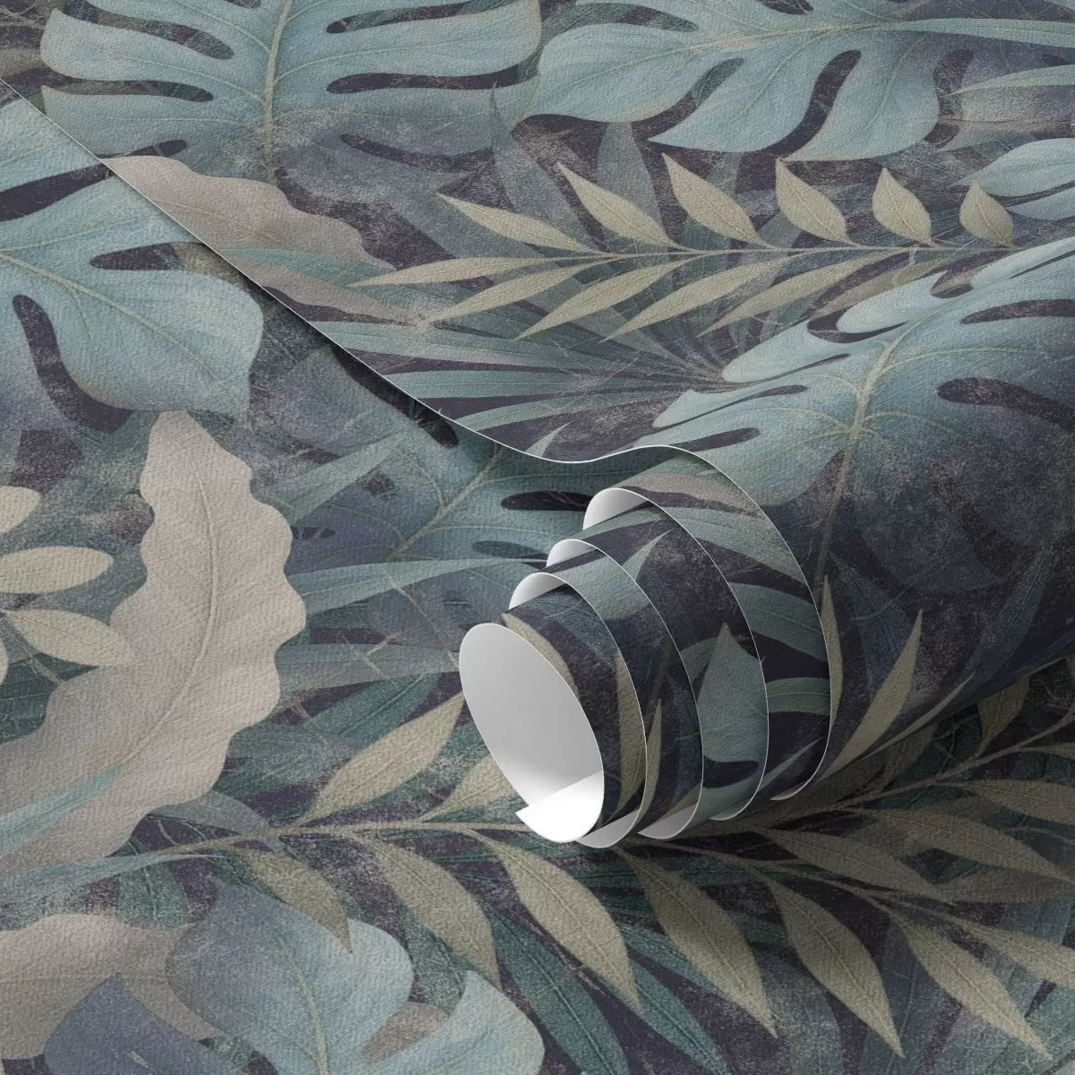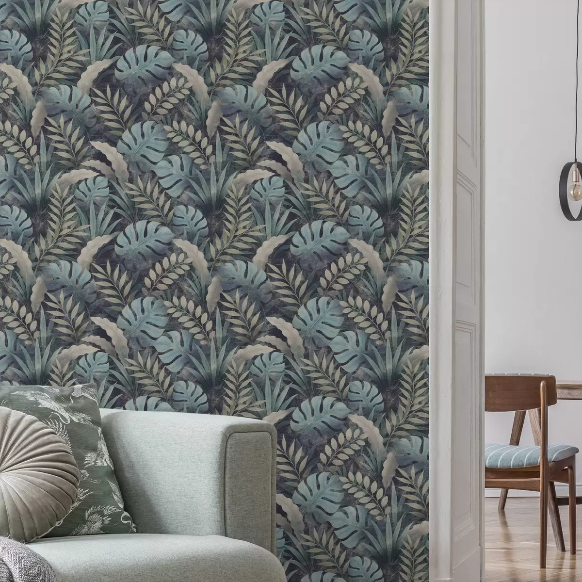 Tapeta Tropsko lišće u hladnim plavo-zelenim tonovima br. a01035