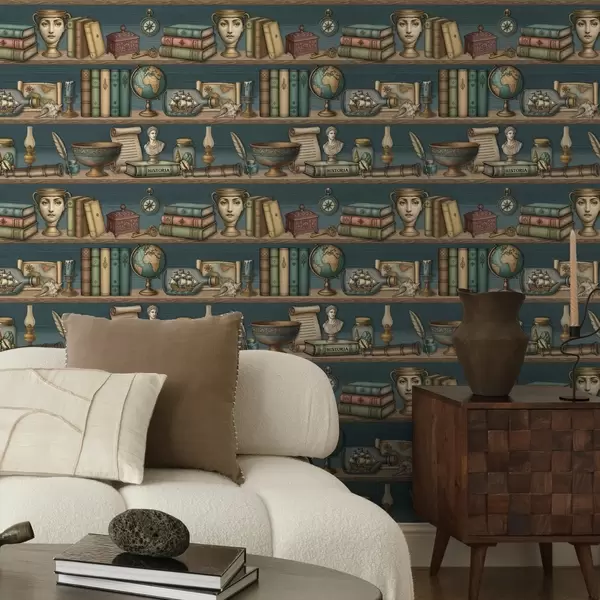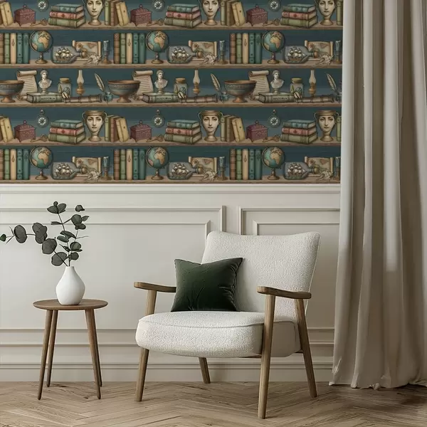 Tapeta Starinske police s knjigama, globusom i morskim zanimljivostima br. a01036