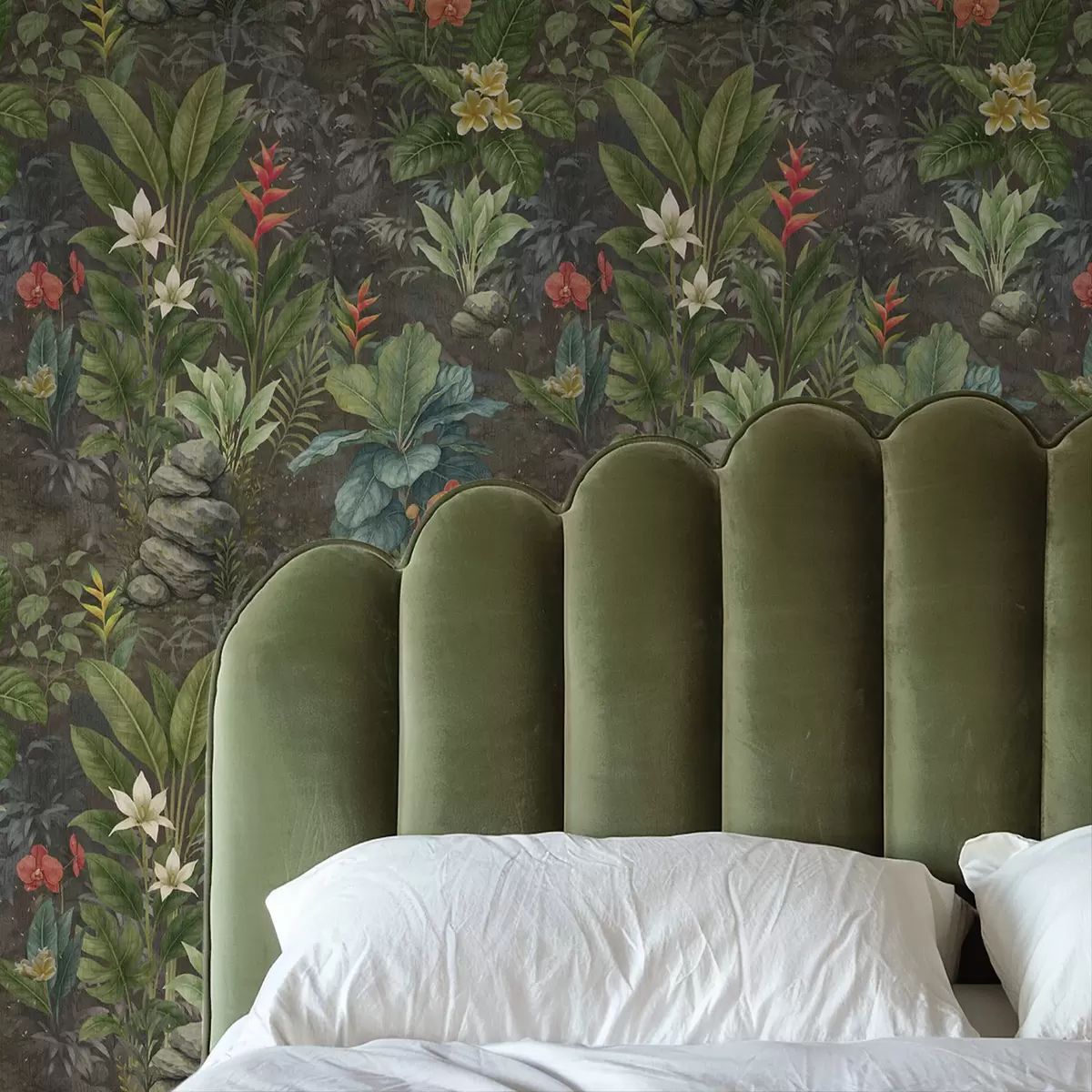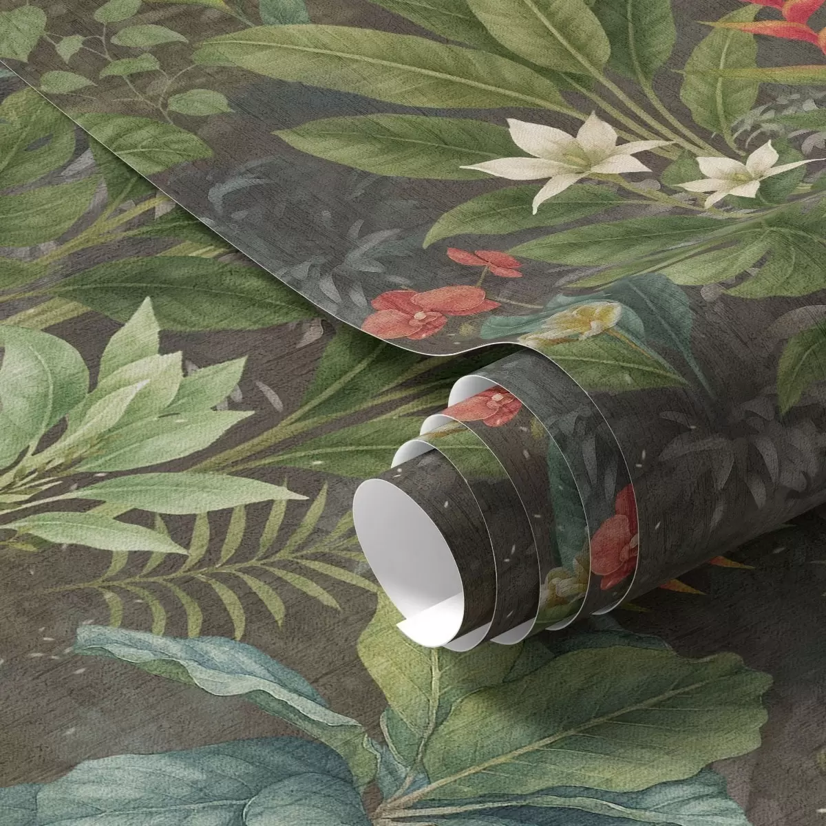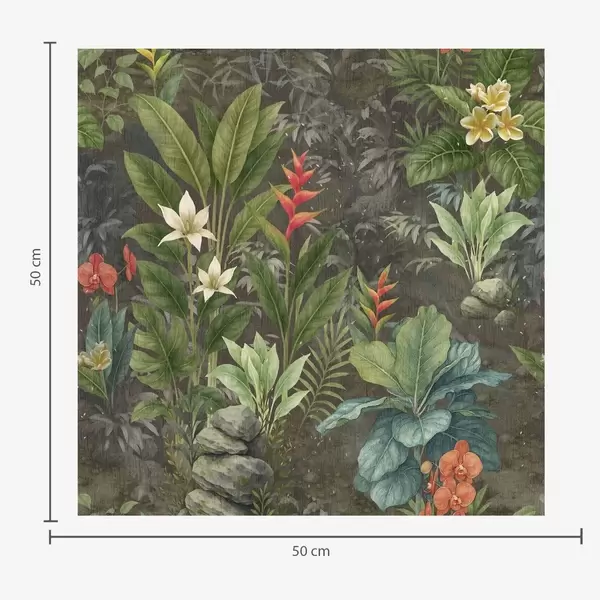 Tapeta Tamni tropski vrt sa svijetlim cvijećem i lišćem br. a01079
