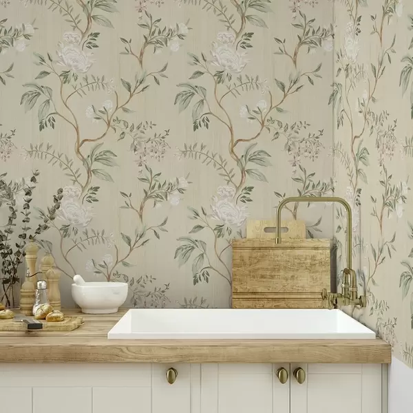 Tapeta Nježne grane s cvijećem na toploj krem pozadini br. a01084